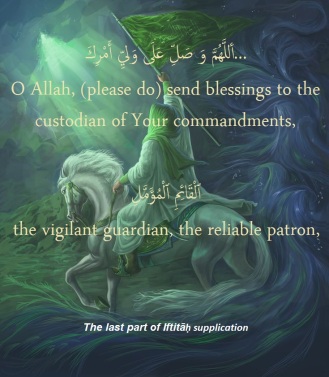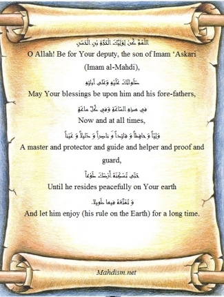 "… Where is the one shattering the arms of the aggressors? Where is the one demolishing the edifices of polytheism and hypocrisy? Where is the one annihilating the people of wickedness, disobedience, and insurgency? Where is the one uprooting the branches of misguidance and division? Where is the one erasing the traces of deviation and personal desires? Where is the one severing the ropes of fabrication and forgery? Where is the one terminating the insolent defiant and persistent rebels? Where is the one tearing up the people of obstinacy, misleading, and atheism? Where is the one ennobling the lovers (of Allah) and humiliating the enemies? …" (Mafātīh al-Jinān, the supplication of al-Nudbah)